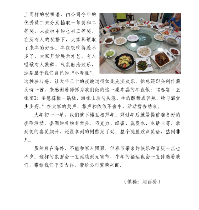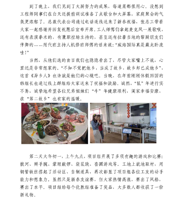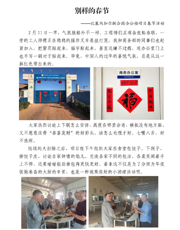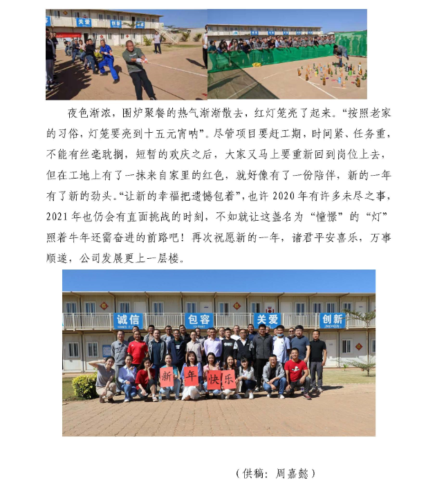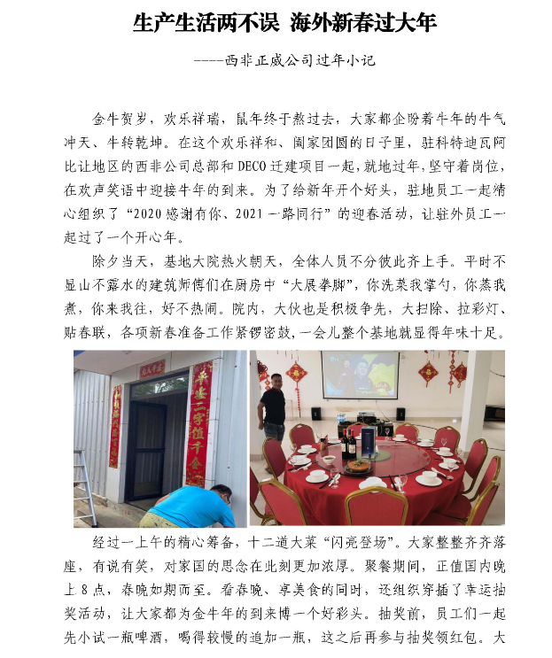 春節(jié)期間,公司駐外員工堅守一線,30多個工程項目仍在有序推進(jìn),800多名建設(shè)者們把工地當(dāng)家,在異國它鄉(xiāng)的平凡崗位上書寫不凡。當(dāng)然,在這個全球華人同喜共慶的歡樂時刻,大家也不忘貼對聯(lián)、掛燈籠、畫年畫,聚在一起吃頓熱騰騰的年夜飯,其樂融融地觀看春晚。有的項目組還給大家準(zhǔn)備了新春禮物,有的舉辦了趣味盎然的慶?;顒印ぁぁぁぁぁ?。下面,就讓我們一起來感受一下他們的別樣“年味”。