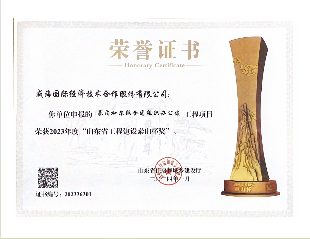 The United Nations office building project in Senegal, built by WIETC in PPP mode, won the “Mount Tai Cup Award” in 2023. Recently, the Shandong Provincial Department of Housing and Urban-Rural Development issued a certificate of honor. This is the first time that the company's overseas engineering project has won this award. Congratulations!