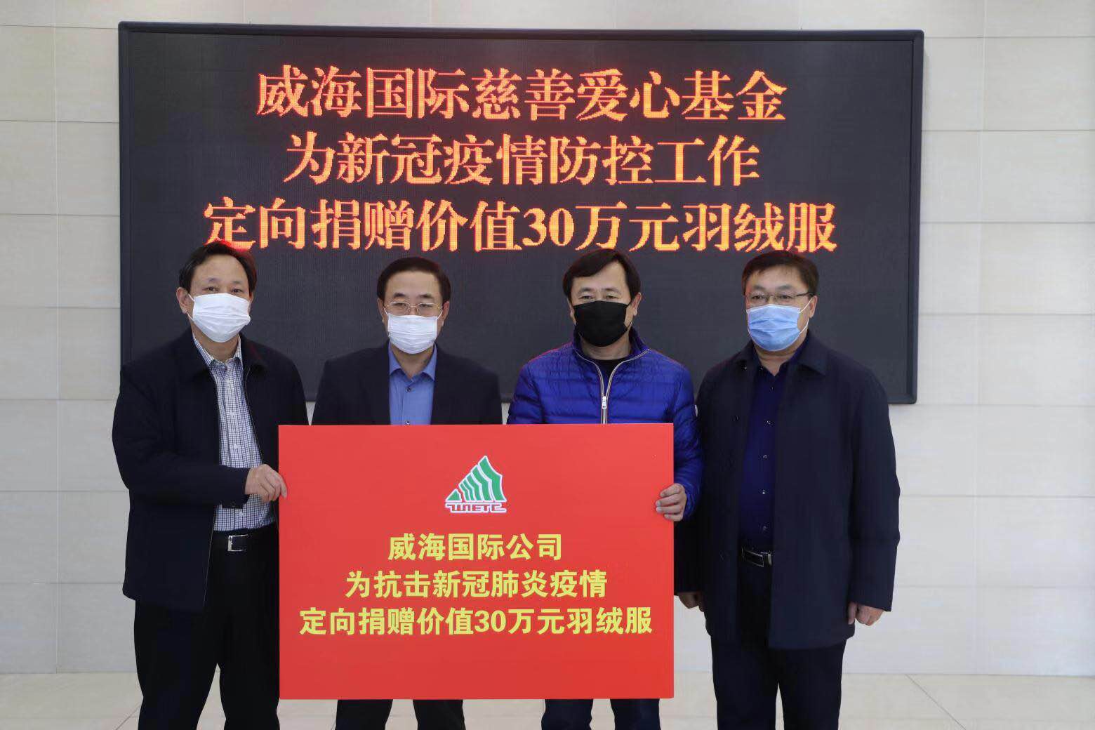 2月5日下午,威海國際公司慈善愛心基金為新冠肺炎疫情防控工作定向捐贈(zèng)價(jià)值30萬元的羽絨服,助力威海市新冠肺炎疫情防控工作的開展。